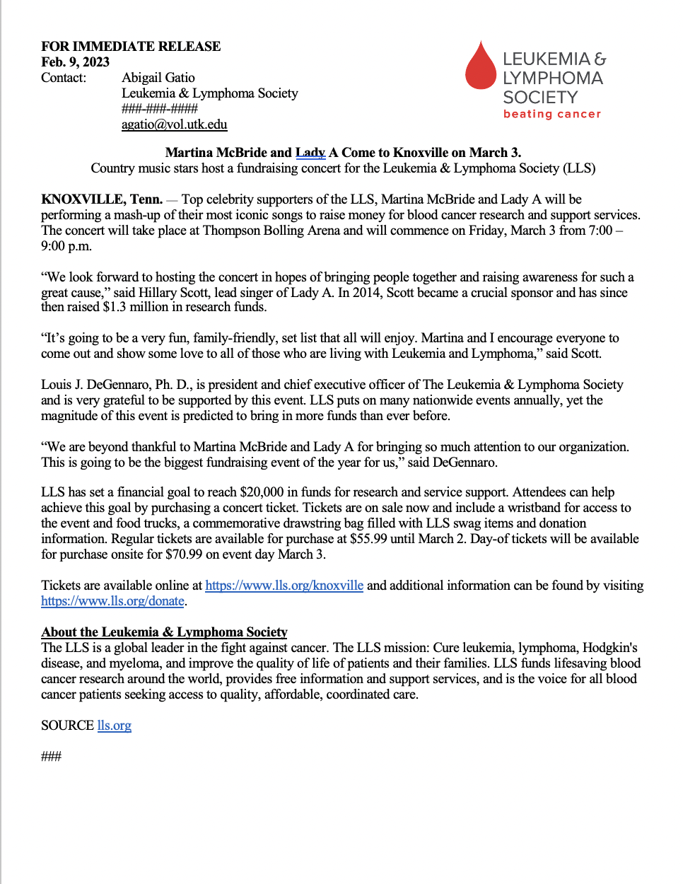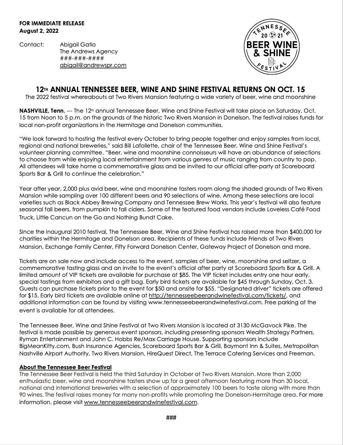 Tennessee Beer, Wine and Shine Festival 2022 Class Assignment - WLF Press Release Class Assignment - LLS Press Release Slide 1 Slide 1 (current slide) Slide 2 Slide 2 (current slide) Slide 3 Slide 3 (current slide)